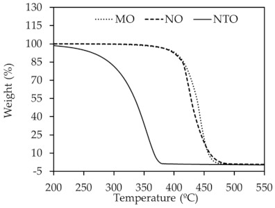 The thermal stability of vegetable oils and NTO was evaluated by TGA. The resulting TGA thermograms and decomposition temperatures are shown in Figure 1 and Table 3, respectively. It can be seen that NTO shows relatively poor thermal stability as proved by the lowest values of maximum decomposition rate temperature (Tmax) and onset temperature (Tonset) among the oils studied. The decomposition temperature range is also broader than those of the vegetable oils. This might be due to the mixed composition of aromatic carbon, naphthenic carbon and paraffinic carbon in NTO. The vegetable oils, in contrast, display higher Tmax and Tonset with narrower ranges of decomposition temperature than NTO. Tmax values are found at 444 °C, 422 °C and 355 °C for MO, NO and NTO, respectively. NO has slightly lower Tmax than MO due to the difference in fatty acid type.