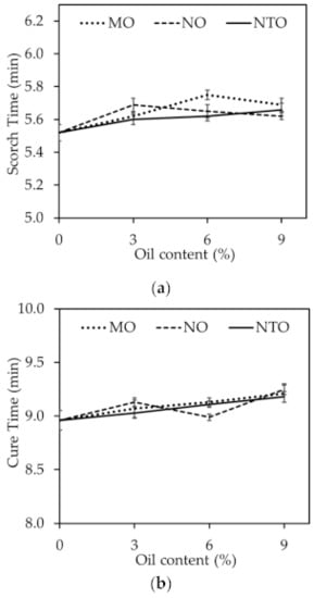 (a) Scorch time and (b) cure time of the rubber compounds comprising different oil types and contents.