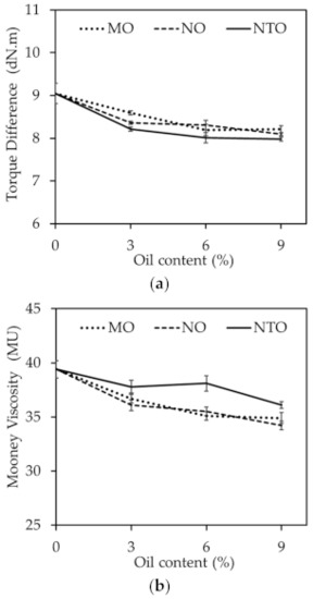 (a) Torque difference and (b) Mooney viscosities of the rubber compounds comprising different oil types and contents.