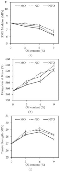 Elongation at break and 300% modulus of the NRCs are displayed in Figure 7. Obviously, modulus of the NRCs decreases with increasing oil content, while the opposite trend is found for elongation at break. This can be explained by the plasticization effect of oils. It is also observed that the modulus and elongation at break of all NRCs are slightly influenced by the oil type. However, the NRCs comprising NTO possess slightly lower modulus and elongation at break than the corresponding NRCs having vegetable oils, possibly due to the poorer filler dispersion [38,39].