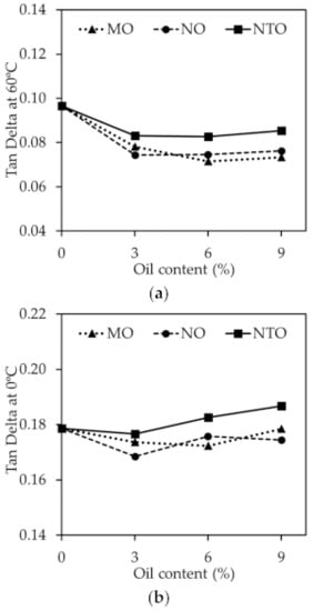(a) tan δ at 0 °C and (b) tan δ at 60 °C of the NRCs comprising different oil types and contents.