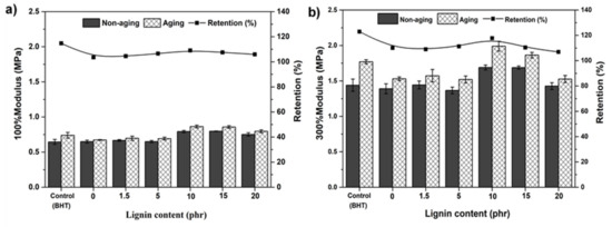 The 100% (a) and 300% (b) modulus of NR/lignin vulcanizates with different lignin contents.