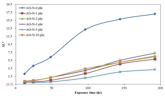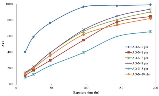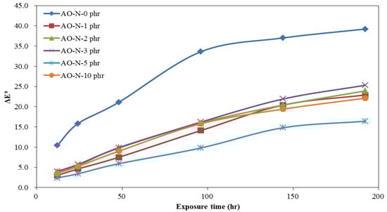 The time-dependent brightness difference (ΔL*), yellowness difference (ΔYI), and color difference (ΔE*) of ROL films with different contents of AO-N after UV irradiation are shown in Figure 2, Figure 3 and Figure 4, respectively. The ΔL* of ROL films increased with prolonged exposure time under UV irradiation. This phenomenon results from the photo-degradation and photo-oxidation to destroy the network structure of ROL and white particle plant gum migrated to the surface []. The ROL film without AO-N (0 phr) had the largest change in the brightness of the film. The result showed that with only 1 phr addition, the ΔL* value could be lowered significantly; however, 5 phr content yielded the best improvement in the brightness of the ROL film. The yellowness difference (ΔYI) of ROL films also increased with increasing UV exposure time; this may be due to the chormophoric group of quinone structures formed from the benzene rings in the ROL film after photo-oxidation. The ROL film without AO-N yellowed seriously after only UV irradiation of 12 h, and a twofold increase in the ΔYI value after UV exposure of 48 h was found. The color difference (ΔE*) is a synergistic effect of ΔL* and ΔYI, and the trend was the same as the ΔL* and ΔYI.