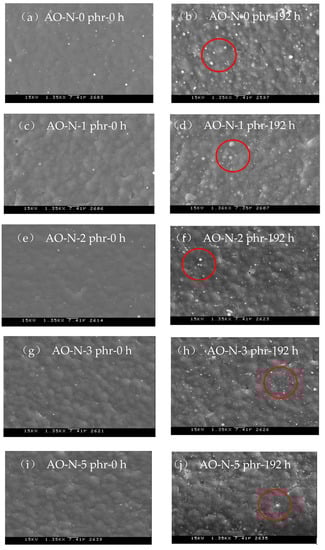 The SEM images of ROL films with different contents of AO-N before and after UV exposure of 192 h are shown in Figure 5. The ROL film without AO-N had more white particles of plant gum (as Figure 5b), which was due to severe photo-degradation under UV exposure [,,,]. However, the white spots were less prevalent in the ROL films with AO-N after UV irradiation. These results were also confirmed by the decreasing ΔL* values of the ROL films after adding the AO-N antioxidant, as shown in Figure 2.