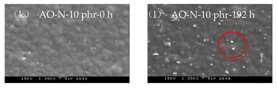 The color change parameters of ΔL*, ΔYI, and ΔE* values after the lightfastness test of 192 h showed that the values of the ROL film without AO-N were 17.1, 99.0, and 39.2, respectively, and all of the values collected with different contents of AO-N were lower than those without AO-N. However, the decrease in the color change parameters was not proportionate to the content of AO-N, i.e., the ROL film with 5 phr AO-N had the lowest ΔL*, ΔYI, and ΔE* values of 3.2, 65.4, and 14.4, and with 10 phr, AO-N increased to 6.4, 81.9, and 22.1, respectively. In practice, the ΔL*, ΔYI, and ΔE* values of the ROL film with 1 phr AO-N were 5.8, 84.4, and 22.9, respectively, and it already demonstrated significant efficiency in improving the lightfastness.