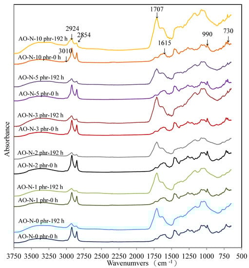 The FTIR spectra of ROL films with different contents of AO-N before and after UV exposure of 192 h are shown in Figure 6. The functional groups of the ROL film without AO-N (0 phr) showed the -OH at 3200–3400 cm−1; -C-H stretching vibration of -C=C-H at 3010 cm−1; -CH2 asymmetric and symmetric stretching vibration of the urushiol side chain at 2924 cm−1 and 2854 cm−1, respectively; -C-O-C- stretching vibration at 1715 cm−1 and -C=O stretching vibration at 1700 cm−1; -C=C- stretching vibration and -C-H out of plane bending vibration of the urushiol benzene ring at 1615 cm−1 and 730 cm−1, respectively; the conjugated triene of the urushiol side chain also can be seen at 990 cm−1 [,,]. The FTIR spectra of the ROL films with different contents of AO-N were similar to that of the ROL film without AO-N before UV exposure. However, after the 192-h lightfastness experiment, the peak at 3010 cm−1 disappeared and those at 2924 cm−1, 2854 cm−1, and 990 cm−1 decreased. The characteristic peaks at 1715 cm−1 (-C-O-C-) and 1700 cm−1 (-C=O) increased and consolidated in a new broad peak at 1707 cm−1. The results showed that the -CH bonding in the side chain fractured by photo-degradation and the peroxides formed. Furthermore, the degradation caused damage to the films and the plant gum migrated to the surface of the film [,]. In addition, the peak at 730 cm−1 also decreased due to the benzene ring degradation, and quinone compounds formed. From the FTIR analysis, it could be concluded that the photo-degradation of the ROL film was a result of the side chain and catechol structure of the network film. This result is also confirmed by the previous study by Hong et al. []. Figure 6 also shows that the ROL films with different contents of AO-N had a similar FTIR spectrum after UV exposure of 192 h, meaning that the peak at 3010 cm−1 disappeared, those at 2924 cm−1, 2854 cm−1, and 990 cm−1 decreased, and that at 1707 cm−1 increased. However, among the spectra, the 5-phr-AO-N-containing film showed the lowest increase in the peak at 1707 cm−1, demonstrating that it possessed the best lightfastness, and this result is also confirmed in Section 3.2.2.