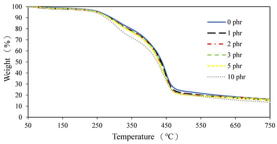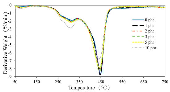 The TGA curves of ROL films with different contents of AO-N are displayed in Figure 7 and Figure 8, respectively. The ROL films with or without AO-N showed similar behavior in terms of thermal degradation. They consisted of three dominant steps at around 100–200 °C, 200–350 °C, and 350–550 °C, corresponding to the water vaporization and decomposition of the low-molecular-weight compounds, the degradation of the side chain of urushiol, and the decomposition of the network structure of the ROL film, respectively. This result is also confirmed by the previous study by Niimura et al. [,]. The results showed that in the second step, the raw ROL film had a temperature of maximum decomposition rate (Tmax) and derivative weight at Tmax around 313 °C and −1.9 %.min−1. The other films with AO-N showed similar results, except for the 10-phr-AO-N-containing one, which had the largest derivative weight at Tmax of −2.9%.min−1. In the third step, the Tmax of raw ROL and 1-phr-AO-N-containing films was 446 °C, while those of the other films were slightly lower than the temperature; for example, that of the 10-phr-AO-N-containing film was 440 °C. The results showed that the thermal stability of the ROL film became inferior after adding AO-N and decreased with increasing content of AO-N due to the decrease in the cross-linking density of the network structure.