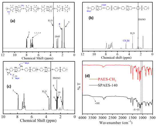 1H NMR analysis to confirm the synthesis of polymer stepwise: (a) poly (arylene ether sulfone) (PAES) (b) bromination of PAES (c) sulfonation of PAES and (d) FT-IR of PAES-CH3 and SPAES-140.