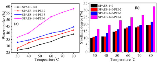 Water uptake and swelling ratio are another important phenomenon for a membrane to be used in the fuel cell application, as seen from Figure 3a,b. The water uptake value is increased with increasing PEI content. The same trend was shown by hydration number, as it is the number of water molecules absorbed in the functional group. This was found to be a maximum ~58% in SPAES-140-PEI-4. This is because of the formation of the more ionic cluster, which also deteriorates the flexibility of the membrane. It was further justified by checking the swelling degree which demonstrates the same behavior as SPAES-140-PEI-4, and the value is 32.65%, which is approximately two-fold higher than that of SPAES and 1.05% higher that of SPAES-140-PEI-3. High water uptake and swelling ration could cause deterioration in the mechanical stability of the membrane for application in electrolyzers [26].