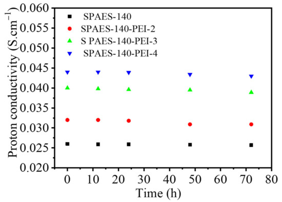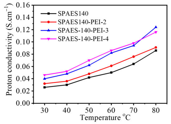 Proton conductivity with the respective hybrid membrane has been shown in Figure 4, with different temperatures ranging under the 100% relative humidity condition. As we can see, the proton conductivity gets increased as we increase the PEI content, and the maximum value was shown by the membrane PAES-140-PEI-3, which is 0.124 Scm−1 and the corresponding value of water uptake is 44%. Thus, it can be stated that the mobility of the ions with water gets enhanced because water molecules can act as additional proton carriers by vehicular mechanism. This can be done by the rapid exchange of protons by hydrogen bridges. Moreover, ionic clusters formed by the branched PEI in the polymer backbone could lead to the formation of some ionic channels for facilitating the proton transport by hopping and vehicular mechanisms. On the other hand, the higher basicity of PEI could also be another factor for enhanced proton conductivity. Because high basicity can make an easier pathway for proton conduction by the hopping mechanism and the surface hopping transport, PEI content may also be considered as a proton transport mechanism that becomes important by increasing the concentration of PEI. The protonation-deprotonation loop formation between two different sites is responsible for strengthening the proton conductivity by lowering the ion transfer barrier [27].