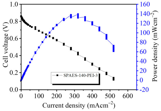 The single-cell fuel cell test was performed at 80 °C under a 100% relative humidity condition for SPAES-140-PEI-3. Open circuit voltage value for the membrane was 0.96 V and the maximum power density of 144 mWcm−2 was achieved by the hybrid membrane (Figure 6). The sulfide linkage in the polymer backbone provided stability to the polymer backbone; further, the sulfonating group attached with the long flexible chain provided steric hindrance to polymers from the attack of radicals forming during the cell test. Due to this reason, hybrid membranes displayed a very slow rate of voltage drop with increasing current density value, proving the durability of the membrane for fuel cell application. On the other hand, the transfer of the proton through the membrane was very well facilitated by the formed ionic cluster from basic pendant group.