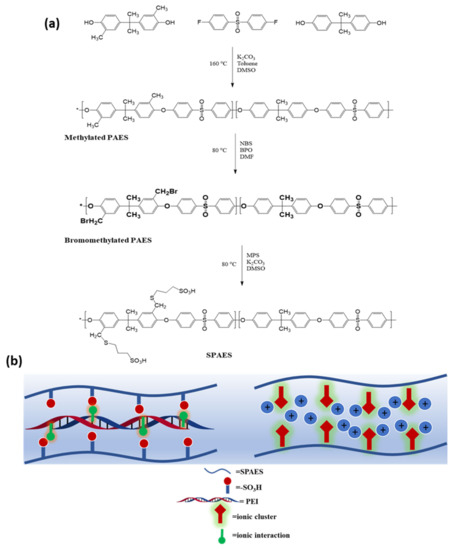 Illustration of step wise synthetic pathway for the (a) sulfonated poly (arylene ether sulfone) (SPAES) and (b) hybrid membrane.