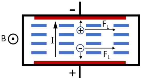 A pump that utilizes the Lorentz force is called magnetohydrodynamic (MHD) pump. Large-scale MHD pumps have been extensively studied as a means for propelling marine vessels [9,10,11]. Smaller-scale MHD pumps are popular for biofluidic applications, since they can be operated at much lower voltage (<10 V) compared to electrostatic and electrowetting pumps (voltages of 100 V and higher are common), which prevents electrostatic discharge problems [8].