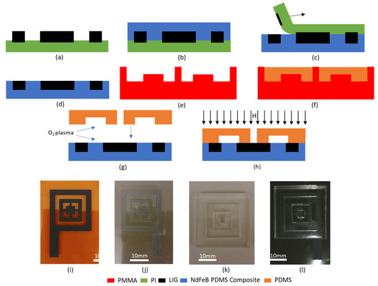 Fabrication of integrated MHD pump (a) laser-induced graphene LIG electrodes on PI, (b) NdFeB-PDMS composite casting, (c) LIG transfer, (d) LIG on magnetic composite, (e) PMMA mold fabrication (f), PDMS casting, (g) oxygen plasma treatment and bonding, (h) magnetization of integrated MHD pump, (i–l) photographs corresponding to steps (a,d,f,h), respectively.