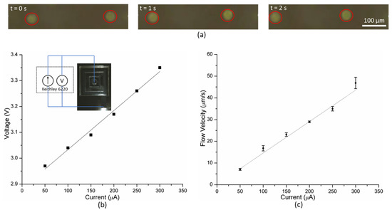 When current is applied, Lorentz force acts on the saline solution propelling the fluid. This causes the suspended fluorescent microbeads to move (for video, see [30]), which is recorded by the microscope as shown in Figure 4a. The flow velocity of the fluid increases with the applied current. The flow velocity vs. current plot (Figure 4c) can be fitted linearly with a high degree of confidence (R2 = 0.98), which agrees well with the theoretical expression (Equation (2)). The current voltage relationship in the operational regime of the MHD pump is linear (Figure 4b). Thereby, the MHD pump can provide higher flow velocity at the expense of greater power consumption.