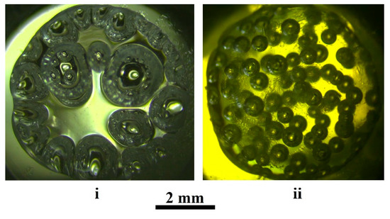 Compared with the cases of significant detuning of the initial pressure from the critical value ( 6.0 MPa or 12.0 MPa), the polylactide matrices synthesized under these conditions are characterized by a significantly more homogeneous structure. As an illustration of this feature, Figure 1 shows the images of polylactide foams at the initial stage of intensive expansion in the course of slow quasi-isothermal depressurization. Case (i) corresponds to a remarkable detuning of the initial pressure below the critical value, while case (ii) corresponds to the foaming mode close to the optimal conditions. Intuitively, we can assume that to obtain the foamed matrices with a more homogeneous structure, it is advisable to use the foaming modes with higher nucleation rates but with low or medium expansion rates of the formed bubble embryos. Indeed, if the nucleation rate is low, then the number of embryos nucleated during a short time interval will be small. With high expansion rates of evolving embryos, the differences in the size of the bubbles appearing at different times will be large, and this will lead to significant variability in the bubble sizes.