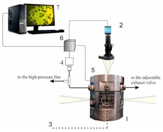 Experimental equipment for the analysis of bubbling in carbon dioxide-plasticized D,L-polylactide. 1—multi-window high-pressure chamber; 2—CMOS camera with the macro-lens and illumination assembly; 3—sapphire glass window (one of seven); 4—pressure gauge; 5—output of the thermocouple; 6—data acquisition assembly; 7—PC. Resistance-type heaters are not shown. Yellow-filled sectors display the side-window and upper-window illumination. The chamber is connected with the CO2-filled controllable high-pressure line via a shutoff valve (not shown).