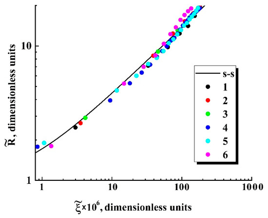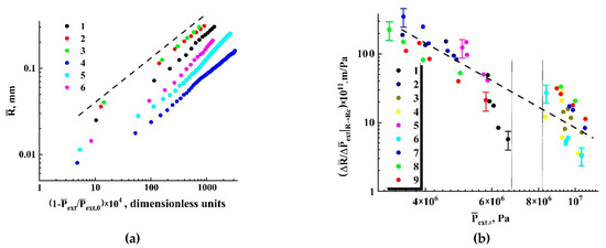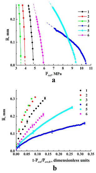 The main feature of the modeled bubble expansion is self-similarity of the dependences in the region of relatively small values of the detuning parameter (1.0 × 10−40.02) for a wide range of the dimensionless parameter . The obtained model dependences characterized by a significant divergence with an increasing dimensionless time lapse (Figure 6) can be transformed to the unique function (Figure 7a) using a change in the variable and the renormalization procedure . Even in spite of significant discrepancies in the behavior of normalized isotherms of carbon dioxide at different values of the initial pressure and temperature detuning from the critical value, the bubble expansion can be adequately considered as a self-similar process, even for relatively large values of