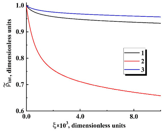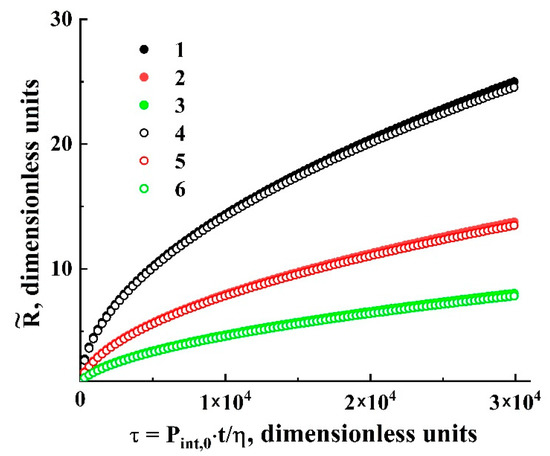 Theoretical dependencies of on the dimensionless time lapse . 1,4— 0.01; 2,5—0.003; 3,6— 0.001. The datasets (1–3) correspond to 310 K and 8.3 MPa; the datasets (4–6) correspond to 333 K and 10.0 MPa.
