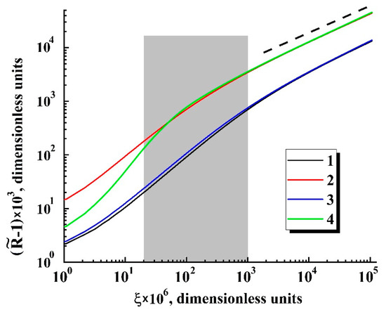 Expected variations of the normalized radii of embryos during the transient stage (results of modeling). 310 K; 1— 4.0 MPa, 0.001; 2— 4.0 MPa, 0.01; 3— 8.3 MPa, 0.001; 4— 8.3 MPa, 0.01. The dashed line displays a trend to the self-similar behavior.