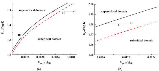 Expected effect of quasi-adiabatic cooling of carbon dioxide in the expanding embryos during the transient stage. Changes in the thermodynamic state of CO2 are presented in the “specific volume - specific entropy” coordinate system. Figure (a) corresponds to lower values of Vs and Ss (higher initial pressures, transitions II and III), while figure (b) displays transition I occurring at a lower initial pressure. The considered cases correspond to those displayed in Figure 11. (I→1, II→2, III→3). The red dashed line ( 304.4 K) defines a borderline between supercritical and subcritical domains. The black solid line ( 310 K) displays the dependence of the specific entropy on the specific volume of carbon dioxide.