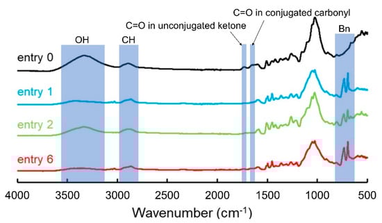 First, with reference to the report by Hon et al., the wood powder was benzylated under the commonly employed treatment conditions [] (entry 1 in Table 1). The weight percentage gain (WPG) of the benzylated wood powder was ~20% of that of the precursor. Figure 1 shows the FT-IR spectra of the precursor (degreased wood powder) and benzylated wood samples. The peak intensity of the hydroxyl groups (3000–3600 cm−1) decreased significantly after the benzylation treatment. On the other hand, IR peaks attributable to benzyl groups appeared at 3020–3080, 1592–1612, 1454–1496, 736, and 696 cm−1 (Figure 1, blue line) []. These changes indicate that the hydroxyl groups were replaced with benzyl groups. The IR spectrum of the precursor (entry 0) shows an IR peak at 1730 cm−1, which is attributed to the acetyl and carboxyl groups of hemicelluloses and aldehyde groups or aliphatic ketones in lignin. In addition, an IR peak at 1660 cm−1, which is attributed to the conjugated carbonyl groups in lignin, was also detected (entry 0) []. The intensities of these peaks decreased after the benzylation reaction (entry 1) because of the alkaline treatment. The acetyl groups were cleaved from hemicellulose during the treatment. In addition, the carbonyl groups in lignin were probably oxidized to carboxyl groups and then to carboxylates. Because of this oxidative decomposition, a certain amount of lignin dissolved in the alkaline solvent. As suggested by Hon et al., the WPG might include the effects of several reactions []. In order to accurately estimate the reactivity of the benzylation step, the relative peak intensities in the FT-IR spectra were analyzed in this study. The decrease in the rate of the hydroxyl group-derived peaks and the increase in the rate of the aromatic ring-derived peaks were calculated. The decrease rate of the OH-derived peak was calculated from the ratio of the peak intensity derived from the OH stretching vibrations appearing at 3000–3600 cm−1 to the peak intensity derived from CH stretching vibrations appearing at 2800–3000 cm−1 (OH/CH intensity ratio, Figure 2). The increase rate of the peaks derived from the benzene rings was calculated from the ratio of the peak intensity derived from the mono-substituted benzene rings that appeared at 680–714 cm−1 to the peak intensity derived from the CH stretching vibrations (Bn/CH intensity ratio, Figure 2). The smaller the OH/CH intensity ratio and the larger the Bn/CH intensity ratio, the greater the number of hydroxyl groups replaced with benzyl groups. The results are presented in the right column of Table 1. The calculated OH/CH intensity ratio of the degreased wood powder (entry 0) is 3.4, and the Bn/CH intensity ratio is 0.1, while the corresponding values for the benzylated wood (entry 1) are 0.8 and 4.9, respectively.