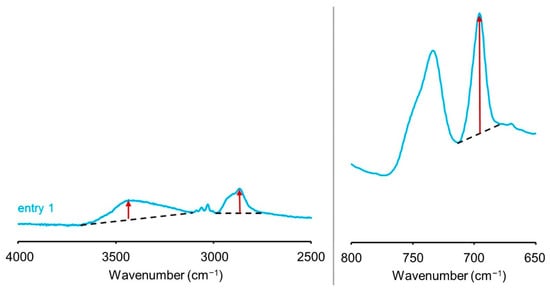 Intensities of peaks at approximately 3400, 2870, and 696 cm−1 in the IR spectra of benzylated wood (entry 1).