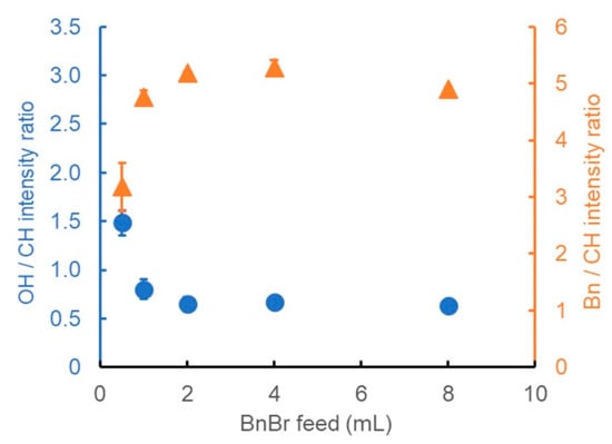 By maintaining the basic treatment conditions the same as for entry 6, the amount of BnBr was changed between 0.5 and 8 mL for the benzylation of wood powder. The corresponding results are shown in Figure 3. When the amount of BnBr was in the range of 0.5–2 mL, the OH/CH intensity ratio (Figure 3, blue circle) and Bn/CH intensity ratio (Figure 3, orange triangle) changed significantly depending on the BnBr amount. On the other hand, when the amount of BnBr was in the range of 2–8 mL, neither the OH/CH intensity ratio nor the Bn/CH intensity ratio changed; they were 0.7–0.8 and 5.1–5.2, respectively. These results suggested that if the amount of BnBr is 2 mL or more, the benzylation proceeds to the same extent as that of the common method (entry 1 in Table 1), even at 25 °C.