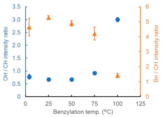 Next, the effect of the reaction temperature on the benzylation treatment was evaluated. Based on the above results, the amount of BnBr was fixed at 4 mL, which is slightly higher than the minimum amount required. Other conditions were maintained the same as those in entry 6. Figure 4 shows the results obtained by varying the reaction temperature of the benzylation treatment between 4 and 100 °C. When the reaction was performed in the range of 4–50 °C, both the OH/CH and Bn/CH intensity ratios were almost constant (Figure 4), indicating that the effect of the reaction temperature was not significant in this range. On the other hand, at 75 °C or higher, the OH/CH intensity ratio increased, and the Bn/CH intensity ratio decreased as the temperature increased, implying that the degree of substitution was low. A similar result was observed with the use of BnCl as the benzylation reagent (comparison of entries 2 and 4). That is, when a 50% [(n-Bu)4P]OH solution was used for the pretreatment, the benzylation of wood proceeded easily under mild conditions, that is, at room temperature. In a previous study, a similar tendency was observed in the case of the etherification of dissolved cellulose []. Although the reason for this tendency is not yet clear, it is possible that some of the [(n-Bu)4P]OH was thermally decomposed at higher temperatures. Another possibility of low degree of substitution is the inactivation of BnBr by [(n-Bu)4P]OH. BnBr reacts with the OH anion of the strong basic solvent to form BnOH, which does not react with wood. This inactivation of BnBr might have been promoted at higher temperature.