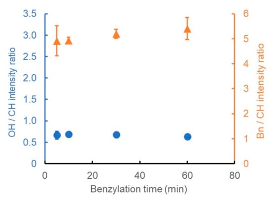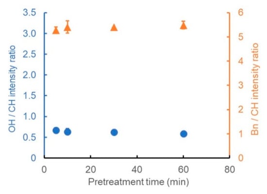 Next, the effect of the processing time was evaluated. First, the pretreatment time with the alkaline aqueous solution was varied between 5 and 60 min. The other conditions were set the same as those in entry 6. The OH/CH intensity ratio was approximately 0.7, and the Bn/CH intensity ratio was approximately 5.3, even with a very short pretreatment time of 5 min (Figure 5). In addition, the OH/CH and Bn/CH intensity ratios hardly changed even when the pretreatment time was prolonged further. Thus, the pretreatment time had almost no effect on the extent of benzylation in the examined range.