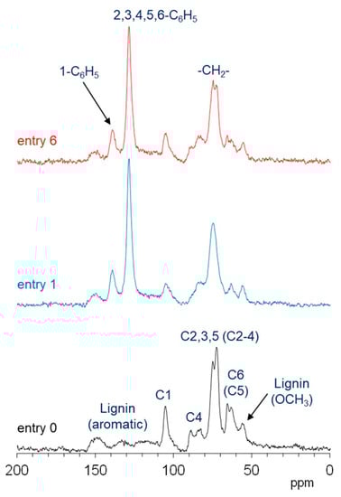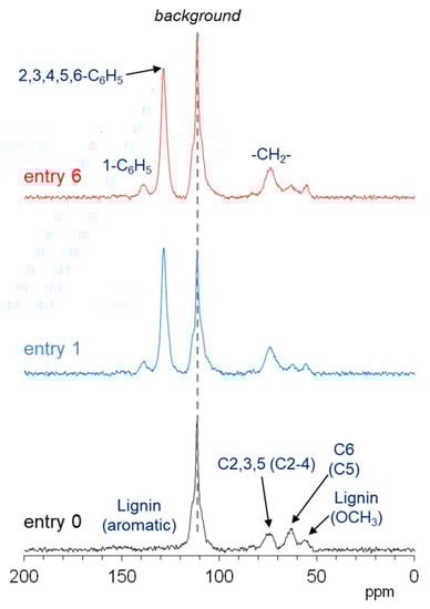 The PST-MAS method enhances the signals of flexible components with high mobility near hydrogen atoms, such as alkyl or alkoxy side chains []. Figure 8 shows the 13C PST-MAS NMR spectra of degreased wood powder (entry 0) and benzylated wood powders (entries 1 and 6). According to the measurement on the empty rotor, the largest signal at 113 ppm was assigned as the background signal originating from the sample rotor and probe. The 13C PST-MAS NMR spectra of degreased wood shows three small signals at 75 ppm (cellulose C2, 3, 5, and hemicellulose C2–4), 63 ppm (cellulose C6 and hemicellulose C5), and 56 ppm (lignin -OCH3) because the intracycle carbons have lower molecular mobility than the terminal carbons. Furthermore, carbons bridging the sugar ring (C1 and C4) could not be detected in the 13C PST-MAS NMR spectra because of rigid glycosidic bonds.