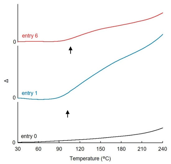 Next, the thermodynamic properties of the degreased and benzylated woods were evaluated by TMA. Figure 9 shows the displacement (μm) of the quartz rod owing to the softening of each sample. In the case of degreased wood (entry 0), there were no inflection points, and the rod sank gradually as the temperature increased. The benzylated wood obtained using the NaOH solution (entry 1) showed an inflection point at 95 °C, after which the displacement per unit temperature rise increased. Norimoto et al. reported that the inflection point corresponds to a change in the benzylated wood from a glass state to a rubber flow state []. Meanwhile, the benzylated wood obtained using the [(n-Bu)4P]OH solution (entry 6) also showed an inflection point at 105 °C; however, the displacement of the quartz rod was smaller than that observed with the case of entry 1. The smaller displacement was caused by the higher crystallinity of the cellulose. Nevertheless, the TMA results suggest that the benzylated woods obtained using both the NaOH and [(n-Bu)4P]OH solutions have a softening point, implying that they exhibit thermoplasticity. Thus, wood was rendered thermoplastic even with the low-temperature benzylation using the [(n-Bu)4P]OH solution for pretreatment.