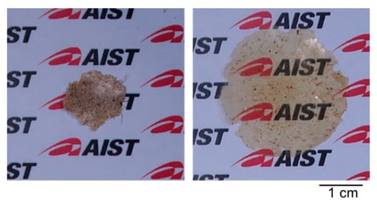 To confirm that the benzylated wood is thermoplastic, we attempted to obtain a film by hot pressing. When the degreased wood (entry 0) was pressed between two dies, a mass of wood powder was obtained (Figure 10, left). As the wood powder was not fused, it crumbled easily when pinched with the fingers. On the other hand, the benzylated wood powder obtained using the [(n-Bu)4P]OH pretreatment solution (entry 6) melted between the flat dies heated at 160 °C and fused to form a translucent film (Figure 10, right). This result clearly suggests that low-temperature benzylation provides a wood powder with thermoplasticity, which can be molded.