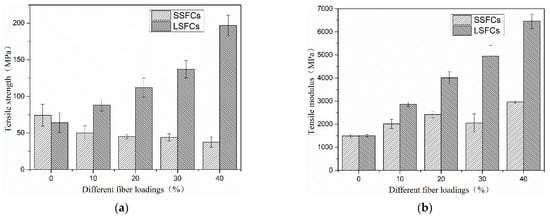 However, the premixes of SF and PLA prepared by the extrusion-rolling premixing process had basically no mechanical damage, and the fiber still maintained its original length and mechanical strength in the matrix. During hot-press molding, the fibers were placed in the best orientation. Therefore, when the composite material was under tension, the fiber and the matrix could effectively transmit tensile stress. The presence of continuous long fibers could avoid defects caused by short fibers. Therefore, the strength of the composite material was mainly determined by the fiber and the matrix themselves. The tensile strength of the composite material increased along with the increase in fiber loading. The tensile strength reached a maximum of 200.44 MPa when the fiber content was 40 wt%, which was 3.06 times that of pure PLA. As can also be seen in Figure 5b, the continuity or orientation of fiber in the LSFCs made the tensile modulus increase rapidly as the fiber content increased.