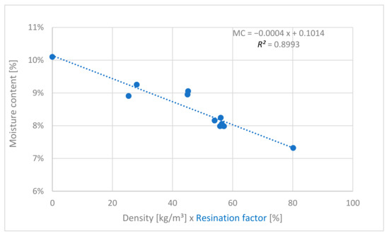 The moisture content (MC) was evaluated according to EN 322:2005 [45] for the produced boards with a very low coefficient of variance, under 3%, for all panels (after climatization at 20 °C and 65% relative air humidity). Because the MC could be influenced by the density and the resination factor, regression analysis was performed, by multiplying the two variables (Figure 1). Also, this model was verified using an F-test, to be the best suitable combination of the variables, as the highly significant empirical F value of 89 and the R2 value of 0.9 (Figure 1) indicates.