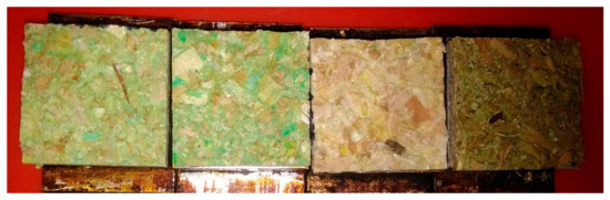 The analysis of variance was performed with an empirical F value of 17.7 at a significance level of 0.05. Despite a relatively high coefficient of variation (17–27%), the influence of the resin application method is highly significant. By comparing the sprayed samples, C12S_M (IB = 0.15 N/mm2), with the poured ones, C12P_M (IB = 0.10 N/mm2), a loss of strength can be identified at the IB values as well as an increased number of green spots (Figure 3). Also, the color of the board changes to a lighter green, when the adhesive is sprayed. This indicates that the IB benefits from the homogeneous distribution of the resin and emphasizes the use of pigments as a way of visualizing the adhesive distribution when mixed with the raw material. On the other hand, the C12S_D samples showed almost no coloration. It is assumed that a large amount of adhesive was lost out of the mixer during application because the drum mixer couldn’t be tightened. Therefore, the gluing method with the drum mixer turned out to be unsuitable for this purpose. The reference specimens showed a homogenous resin distribution but at a level of IB of 0.06 N/mm2, which did not reach the measured values of C12S_M.