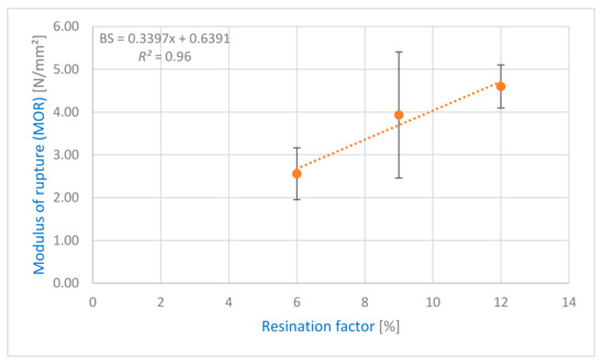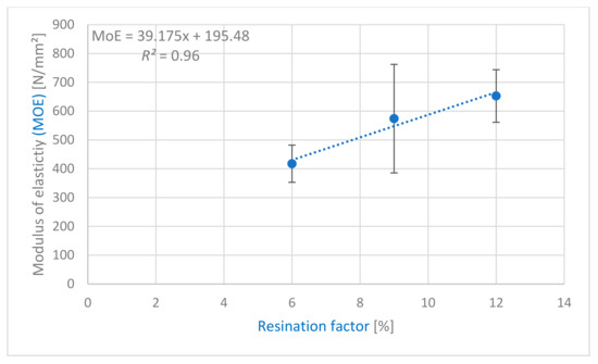 Similar to the IB, analysis of variances was performed with an empirical F value of 6.5 at a significance value of 0.05 for the MOR values. The lower empirical F value indicates that the MOR is less influenced by the adhesive application method than the IB. Especially samples C12S_M, with a MOR of 4.60 N/mm2, and C12P_M (4.5 N/mm2) showed an insignificant difference. However, the process with the sprayed adhesive application (C12S_M) seems to be more stable compared to the poured ones, because the variance of the samples showed a 5.7% coefficient of variation and the results showed a less inclined distribution. Samples C12S_D were on the contrary, with a MOR of 2.6 N/mm2 underlining the unsuitability of the used drum mixer, as outlined in 3.3.1 (IB). Figure 4 shows a high positive correlation (R2 = 0.96) of the adhesive content (%) with the MOR. The positive correlation does not show any significant negative impacts, that could have been caused by the pigment, and its influence on the MOR and MOE is neglectable (Figure 4 and Figure 5).