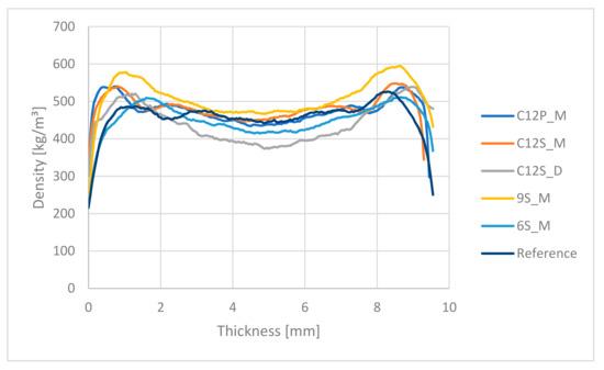 In the case of an industrially manufactured 10 mm P2 particleboard with an average density of over 700 kg/m3, the peaks reach a density over 800 kg/m3 and a core density of about 500 kg/m3, which can easily explain why the MOR, and partially IB, are superior to the laboratory manufactured PS panels.