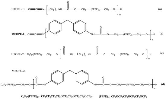 Chemical structure of (a) HFOPU-1 polyurethane, (b) MFOPU-1 polyurethane, (c) HFOPU-2 polyurethane, and (d) MFOPU-2 polyurethane.