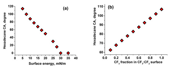 To comprehend and visualize the situation, we show in Figure 2b HDCA dependence on the composition of surface occupied by a mixture of CF3 and CF2 functionalities. To populate the graph Israelachvili and Gee equation for the contact angle on chemically heterogeneous surfaces was employed [71,72,73]: