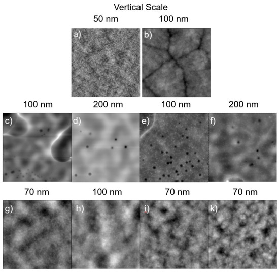 AFM (10 µm × 10 µm) topographical images of polymer films before (a,c–f) and after (b,g–k) annealing. Pure PET (a,b), and 5% FOPU/PET films (c–k). Before annealing: (a) Pure PET (RMS = 0.3 nm), (c) HFOPU-1/PET (RMS = 13.5 nm), (d) HFOPU-2/PET (RMS = 15.0 nm), (e) MFOPU-1/PET (RMS = 8.0 nm), and (f) MFOPU-2/PET (RMS = 17.0 nm). After annealing: (b) Pure PET (RMS = 8.0 nm), (g) HFOPU-1/PET (RMS = 9.0 nm), (h) HFOPU-2/PET (RMS = 16.0 nm), (i) MFOPU-1/PET (RMS = 8.5 nm), and (k) MFOPU-2/PET (RMS = 11.0 nm). RMS is the root-mean-square roughness determined using AFM software from the topographical images.