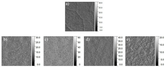 PET films blended with 5 wt% of FOPU materials were prepared by dip coating, dried at ambient conditions for 16 h, and then annealed at 140 °C for 3 h under vacuum. The annealing temperature was above the FOPUs’ thermal transitions and the Tg of PET (70–80 °C [7,60,61]), yet below the melting temperature of PET (250–260 °C [7,60,61]). The micro/nanoscale morphology of the blended films along with the film made from pure PET was visualized using atomic force microscopy (AFM) topographical imaging (Figure 3). It was observed that the films fabricated from solutions are without visible crystal formation. It was also apparent that PET and FOPU oligomers are, to some extent, immiscible and appear to be phase-separated on the AFM topographical images. The annealing significantly influenced the surface morphology of FOPU/PET and PET films. PET crystalline structures are visible on the surface of pure PET films after the thermal treatment. We also noted that, for the annealed FOPU/PET films, PET crystalline structures and phase separation are not clearly observed on the topographical images. It appears that FOPUs spread over the PET surface, forming a continuous layer as a lower surface energy component for thermodynamical reasons [7].