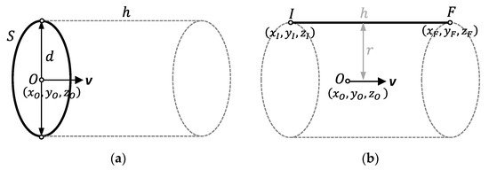 Following Henke et al. [16], this first step defines an optimal verification strategy for characterizing form errors with the minimum number of points. The proposed DfAM approach establishes a bi-univocal relationship between verification points and design parameters. An evaluation test specimen shall be manufactured and digitized using the original parameterization, to perform an initial analysis of form deviations. In the case of right circular cylinders, CAD designers usually employ two alternative parameterizations to define the boundaries that enclose the solid: extrusion of a circumference or revolution of a generatrix (Figure 3). In an extrusion operation, a planar cross-section is extruded a distance (h) along a straight direction (v). Most CAD systems have a specific command to generate orthogonal extrusions, so that the normal to the plane that contains the cross-section defines the extrusion direction. In the case of right circular cylinders, the cross-section is a circumference defined by the location of its center (O) and its radius (r) or diameter (d).