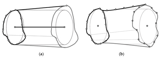 In a CAD system, the re-parameterized cylinder will be originally constructed by using a loft operation from a combination of cross-sections and generatrixes, which have been created from bi-dimensional splines parameterized by means of the radial distance between each node and the axis (Figure 7a).