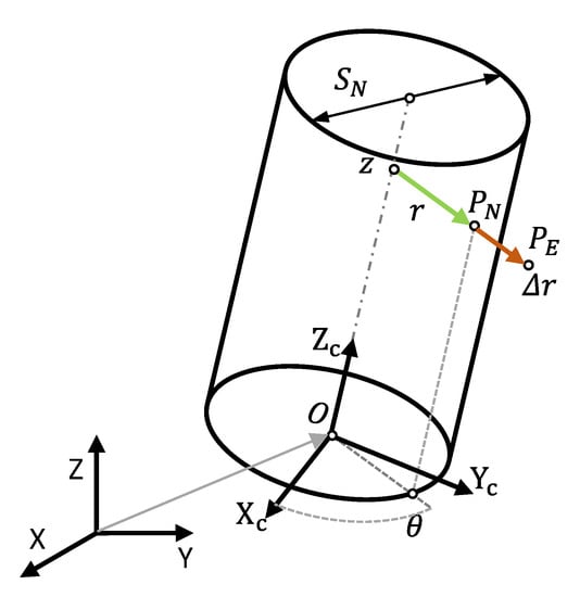 According to the proposed DfAM strategy, the objective of an ideally exact manufacturing requires the radial distance of each node in the nominal cylinder with respect to the nominal axis to be equal to the radial distance of the corresponding point in the actual (manufactured) cylinder with respect to the LSRC axis. This condition would implicitly assume that the nominal, actual, and LSRC cylinders are identical. Nevertheless, inaccuracies of manufacturing systems will cause each extracted integral cylinder and its associated integral cylinder to deviate from the nominal cylinder. Accordingly (Figure 5), each extracted point (PE) digitized on the surface of the manufactured cylinder will be displaced a distance (Δr) in the normal direction to the nominal surface with respect to the corresponding nominal point (PN).