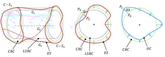 Figure 6 provides an example of deviation mapping and design compensation. From the data of the extracted surface (ES) obtained during the deviation modelling step, a LSRC is defined. Next, a CRC is built to calculate Δr values for each verification point. Each ΔK value for a particular point is then calculated from its correspondent Δr values (Equation (3)), and the position of a compensated point (PC) is finally obtained. Repeating this procedure for all nodes in the re-parameterized design, an optimized cylinder (OC) is defined for each combination of relevant factors determined from the ANOVA.