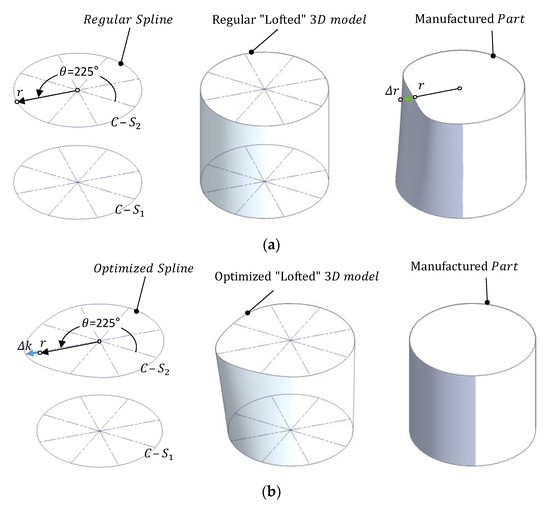 An example of 3D model generation with the loft operation and the expected results after manufacturing: (a) Based on regular non-distorted splines; (b) based on the calculated compensation.