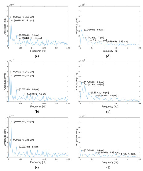 Results of the fast Fourier transform (FFT) for local deviations. Cross-sections: (a) ; (b) ; (c) . Generatrixes: (d) ; (e) ; (f) .