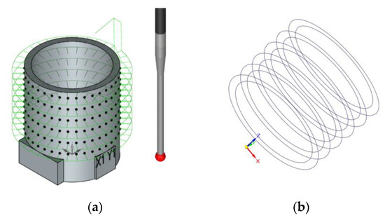 Accordingly, fc for cross-sections was 0.0333 Hz, and an adequate sampling period should be lower than 15° to match the Nyquist criterion. In the present work, it was decided that a 10° sampling strategy (36 points per section) would be used to digitize cross-sections. Applying the same criterion to the generatrixes, the frequency content in that direction would be neglected. Nevertheless, low frequency components pointed out that a certain variation along the direction of the axis could be observed. Considering the digitized length in the test specimen, a minimum sampling period should be shorter than 10 mm. In the present research, a 5 mm sampling strategy has been adopted, and verification was based on six cross-sections covering 30 mm (Figure 9a).