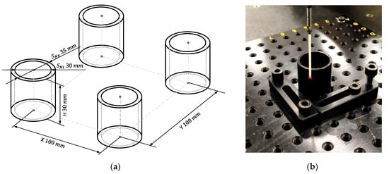 (a) Disposition of test specimen in the tray. (b) Measurement of a test specimen in the Coordinate Measurement Machine (CMM).